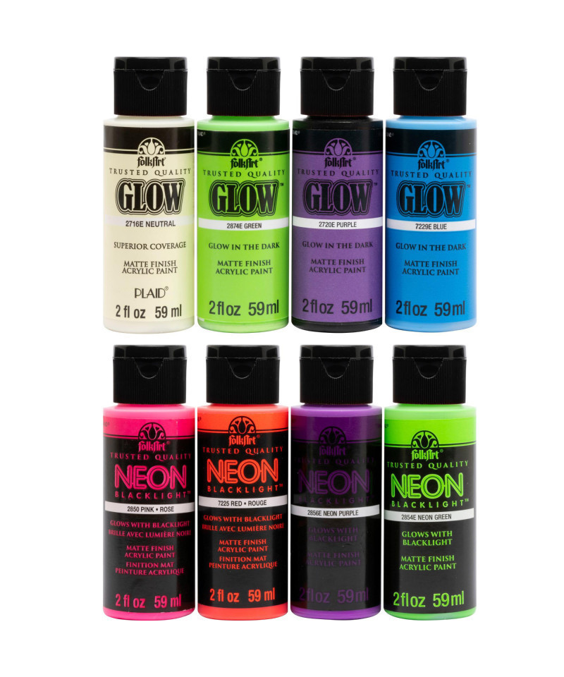 - CONVENIENT SIZES - This versatile glowing and neon acrylic paint set includes 8 - 2 oz bottles of vivid, colorful and glowing craft paint. The colors in this kit include: four neon colors: neon pink, neon orange, neon blue, neon green and four glow in the dark colors: neutral glow, green glow, yellow glow, and pink glow
