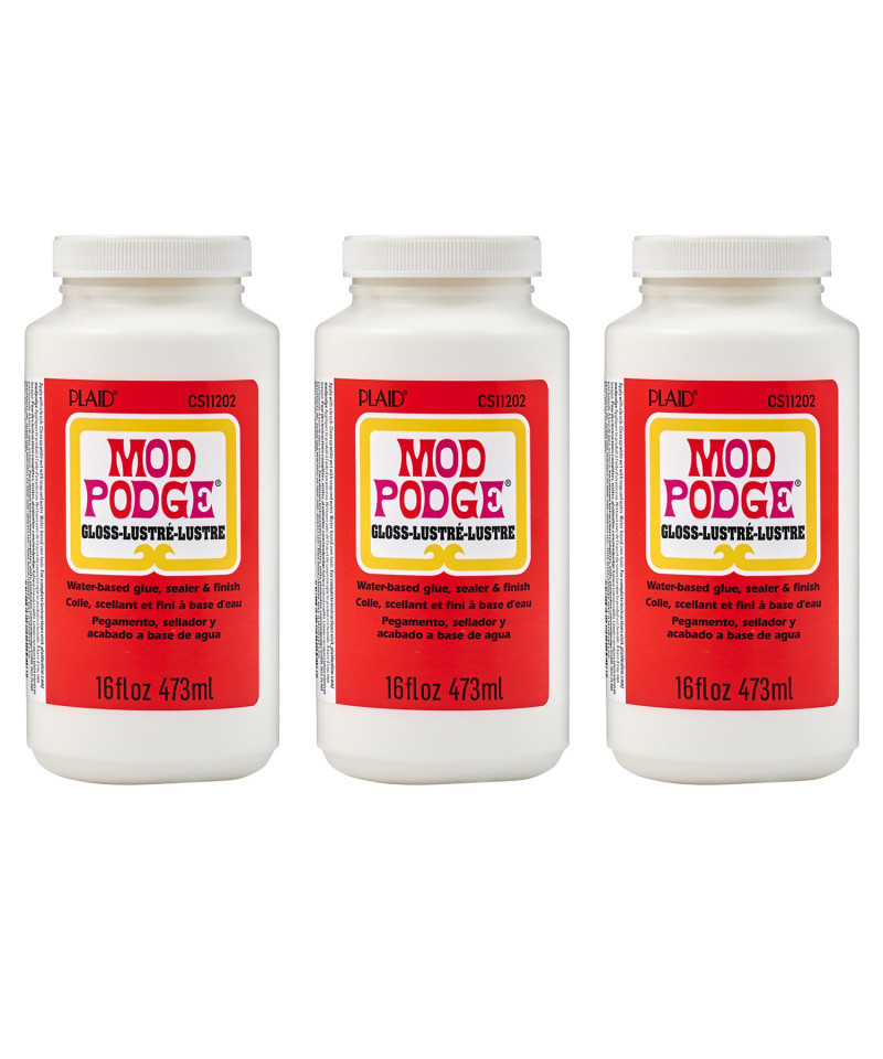For over 55 years Mod Podge has been America's favorite glue, sealer, and finish. Mod Podge Gloss is quick-drying and dries clear, leaving a smooth, glossy finish. Preserve the beauty of your decoupage paper projects and more with this multi-purpose, all-in-one sealant, glue, and finish. Use this decoupage glue to create decoupage tissue paper projects as well as projects using wood, fabric, plastic, and canvas! This handy decoupage glue comes in a variety of finishes such as gloss, matte, glitter, satin, outdoor, dishwasher safe, and many other unique formulas for every project. Let your creativity come alive with the limitless possibilities of Mod Podge Gloss. Sold as a pack of three 16 oz. bottles of Modge Podge Gloss.