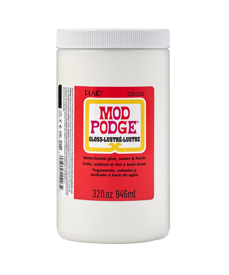 For over 55 years Mod Podge has been America's favorite glue, sealer, and finish. Mod Podge Gloss is quick-drying and dries clear, leaving a smooth, glossy finish. Preserve the beauty of your decoupage paper projects and more with this multi-purpose, all-in-one sealant, glue, and finish. Use this decoupage glue to create decoupage tissue paper projects as well as projects using wood, fabric, plastic, and canvas! This handy decoupage glue comes in a variety of finishes such as gloss, matte, glitter, satin, outdoor, dishwasher safe, and many other unique formulas for every project. Let your creativity come alive with the limitless possibilities of Mod Podge Gloss. Includes one 32 oz. bottle of Modge Podge Gloss.