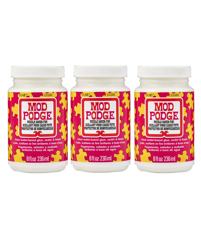 For over 55 years Mod Podge has been America's favorite glue, sealer, and finish. Mod Podge Puzzle Saver is quick-drying and dries clear, leaving a smooth, gloss finish. Preserve the beauty of your puzzle projects and more with this multi-purpose decoupage glue. This all-in-one sealant, glue, and finish is a great way to make sure your hard work stays together in order to display. Let your creativity come alive with the limitless possibilities of Mod Podge Puzzle Saver. Sold as a pack of three 8 oz. bottles.