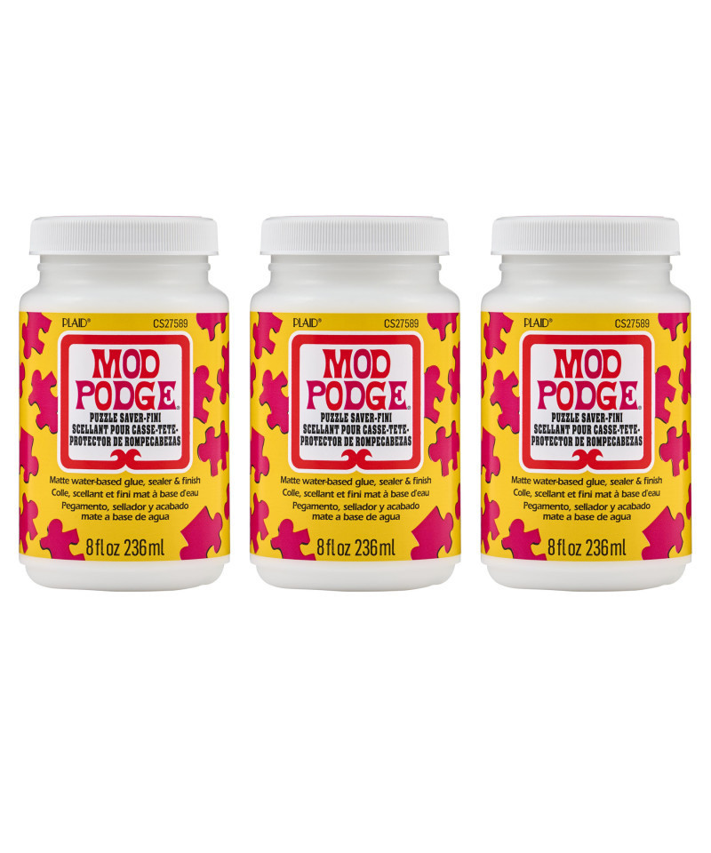 For over 55 years Mod Podge has been America's favorite glue, sealer, and finish. Mod Podge Puzzle Saver Matte is quick-drying and dries clear, leaving a smooth, matte finish. Preserve the beauty of your puzzle projects and more with this multi-purpose decoupage glue. This all-in-one glue, sealer, and finish is a great way to make sure your hard work stays together in order to display. Let your creativity come alive with the limitless possibilities of Mod Podge Puzzle Saver Matte. Sold as a pack of 3 bottles.