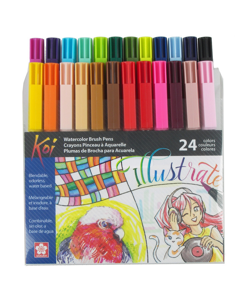 Bright, blendable colors in a brush. Lettering and coloring your artwork is simple with the no-mess Koi® Coloring Brush pens with a durable tip will quickly spring back to its original shape. These pens perform similar to a paint brush allowing fine, medium, or bold brush strokes just by changing the amount of pressure to the nib. The odorless, water-based solvent facilitates smooth blending and layering of colors. Koi Coloring Brushes are a convenient way to add vibrant color to any sketch, journal, cartoon, illustration, or rubber stamps. Transparent ink colors blend easily to create a multitude of hues and effects. Use the colorless blender pen or Koi Water Brushes to create seamless washes, layering and color gradations.