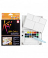 Koi Water Colors are fun and vivid watercolor paints to illustrate, decorate and create art with! This compact kit contains 18 vibrant watercolors and includes a mixing palette in the lid of the box, a sponge and a Koi Water Brush (brush with water tank). Koi's rich color assortment offers the choice to create bold hues or soft and subtle shades. Keep this small set close by in your studio for a quick splash of color and to create deep washes for backgrounds. Or bring it along to create portraits and plein-air landscapes in the outdoors. This pocket-sized box is also great for adding color to comics, illustrations, and lettering projects.