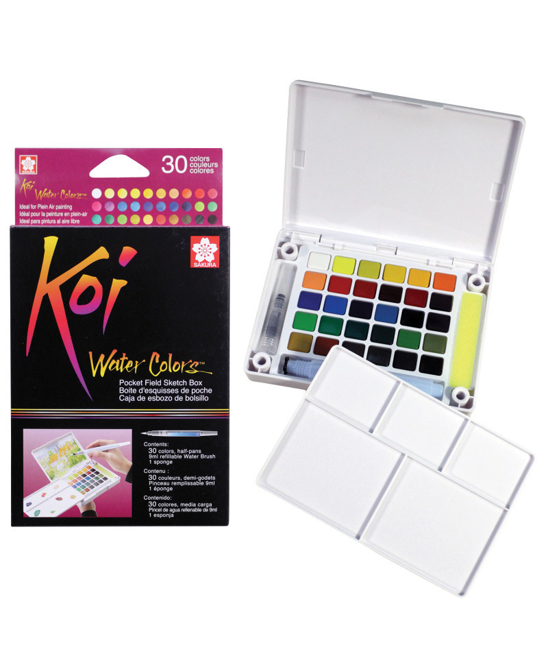 Koi Water Colors are fun and vivid watercolor paints to illustrate, decorate and create art with! This compact kit contains 30 vibrant watercolors and includes a mixing palette in the lid of the box, a sponge and a Koi Water Brush (brush with water tank). Koi's rich color assortment offers the choice to create bold hues or soft and subtle shades. Keep this small set close by in your studio for a quick splash of color and to create deep washes for backgrounds. Or bring it along to create portraits and plein-air landscapes in the outdoors. This pocket-sized box is also great for adding color to comics, illustrations, and lettering projects.