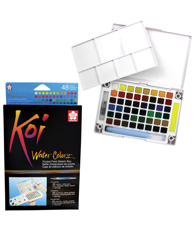 Koi Water Colors are fun and vivid watercolor paints to illustrate, decorate and create art with! This compact kit contains 48 vibrant watercolors and includes a mixing palette in the lid of the box, a sponge and a Koi Water Brush (brush with water tank). Koi's rich color assortment offers the choice to create bold hues or soft and subtle shades. Keep this small set close by in your studio for a quick splash of color and to create deep washes for backgrounds. Or bring it along to create portraits and plein-air landscapes in the outdoors. This pocket-sized box is also great for adding color to comics, illustrations, and lettering projects.