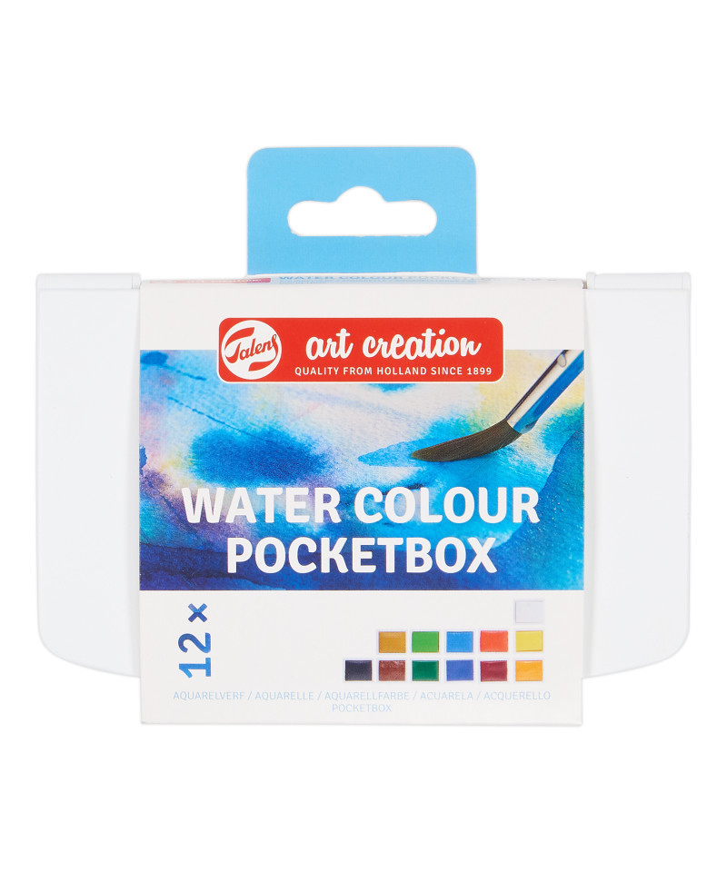 This convenient set of watercolors contains everything you need to paint beautiful watercolor paintings on the go! The sturdy plastic pocket box contains 12 pans of watercolor paint, a travel-size watercolor brush and a sponge to quickly clean your brush with. The lid has plenty of space to mix your colors on. Since the box is so conveniently sized, you can take it with you everywhere you go to create wonderful plein air paintings. Contents: 12 pans (108 Chinese White – 205 Lemon Yellow (Primary) – 200 Yellow – 311 Vermilion – 326 Alizarin Crimson – 535 Cerulean Blue (Phthalo) – 504 Ultramarine – 617 Yellowish Green – 602 Deep Green – 227 Yellow Ochre – 409 Burnt Umber – 708 Payne’s Grey), reversible brush, sponge. Talens Art Creation watercolor is a transparent paint that is applied thinned with water. The more water you use, the lighter the color of the paint becomes. As a result, you can work with many transparent layers on top of one another to create beautiful color effects. Watercolors are not waterproof when dry, so you can rework the paint using water if necessary. Use these colors on dry paper to create sharp details and wet your paper to let the colors flow gently and create seamless color transitions.