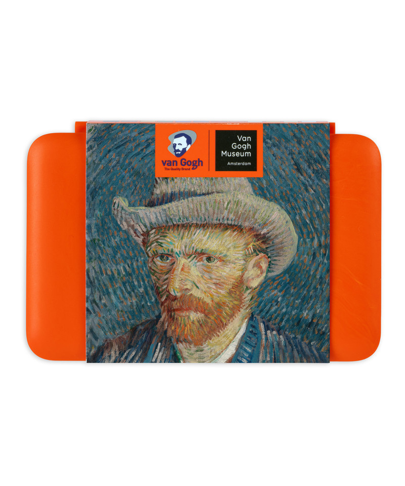 A compact watercolor set with twelve shades inspired by the color palette of Vincent van Gogh's Dynamic Self-Portrait with Grey Felt Hat in which he used complementary colors. This special edition of the Van Gogh pocket box is bright orange, like the small stripes of orange paint that can also be seen in the halo around the head in the self-portrait. This makes the water color pocket box a true collector's item. Contents: 106 Opaque White - 254 Permanent Lemon Yellow - 244 Indian Yellow - 224 Naples Yellow - 278 Pyrrole Orange - 331 Madder Lake Deep - 533 Indigo - 522 Turquoise Blue - 645 Hooker Green Deep - 227 Yellow Ochre - 411 Burnt Sienna - 708 Payne's Grey. This 12-half pan water color set is packed in a plastic pocket box which also includes a round synthetic hair brush (size 6) and a mixing tray. Van Gogh water colors are a student and artist level range of paints featuring brilliant, transparent, and intense colors with high tinting strength. Most colors are rated with the highest degree of lightfastness +++ (100+ years under museum conditions) with a few colors rated just one step below at ++ (25-100 years under museum conditions). Thanks to the purity and uniform viscosity, these water colors are easy to work with and easy to mix. Proudly produced in Holland with stringent quality control for a consistent experience with every purchase.