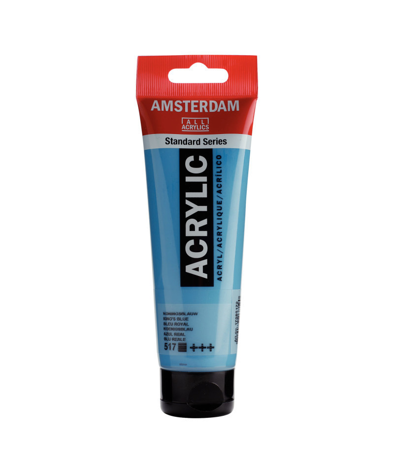 Amsterdam Standard Series acrylic paint in King's Blue (517) is an opaque color with an excellent lightfastness. Our Standard Series offers you the broadest range of remarkably vibrant acrylic colors. This versatile paint is easy to work with and offers a smooth application. Use the paint straight from the tube or thinned with a little bit of water or one of our acrylic mediums. Medium viscosity paint for visible brush strokes, texture and smooth coverage with a satin finish. Made with high-quality, lightfast pigments. Formulated with 100% acrylic resin binder, resulting in an exceptionally durable and flexible paint film with a uniform degree of gloss. Odorless, water-based formula that becomes waterproof and permanent when dry. Extensive range of 102 colors available in 20ml and 120ml tubes, of which up to 90 colors are also available in larger sizes. The range of colors includes both traditional and modern colors such as reflex and metallic variants. Adheres to virtually any slightly porous surface, including canvas, paper, cardboard, wood, stone and cement. Proudly crafted in the Netherlands.