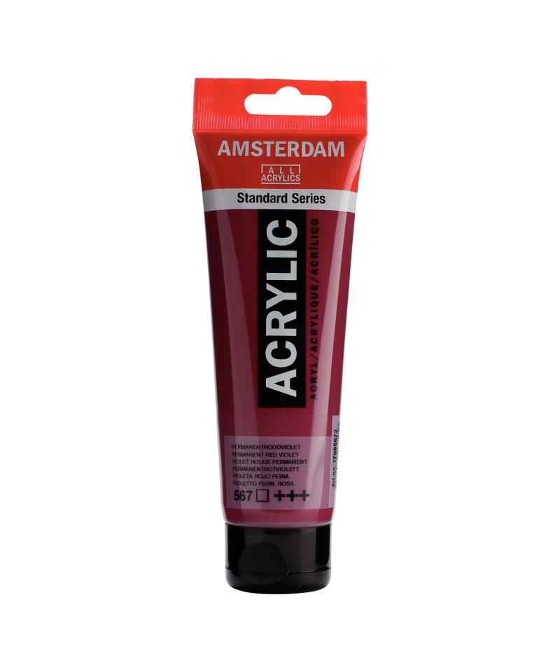 Amsterdam Standard Series acrylic paint in Permanent Red Violet (567) is a transparent color with an excellent lightfastness. Our Standard Series offers you the broadest range of remarkably vibrant acrylic colors. This versatile paint is easy to work with and offers a smooth application. Use the paint straight from the tube or thinned with a little bit of water or one of our acrylic mediums. Medium viscosity paint for visible brush strokes, texture and smooth coverage with a satin finish. Made with high-quality, lightfast pigments. Formulated with 100% acrylic resin binder, resulting in an exceptionally durable and flexible paint film with a uniform degree of gloss. Odorless, water-based formula that becomes waterproof and permanent when dry. Extensive range of 102 colors available in 20ml and 120ml tubes, of which up to 90 colors are also available in larger sizes. The range of colors includes both traditional and modern colors such as reflex and metallic variants. Adheres to virtually any slightly porous surface, including canvas, paper, cardboard, wood, stone and cement. Proudly crafted in the Netherlands.