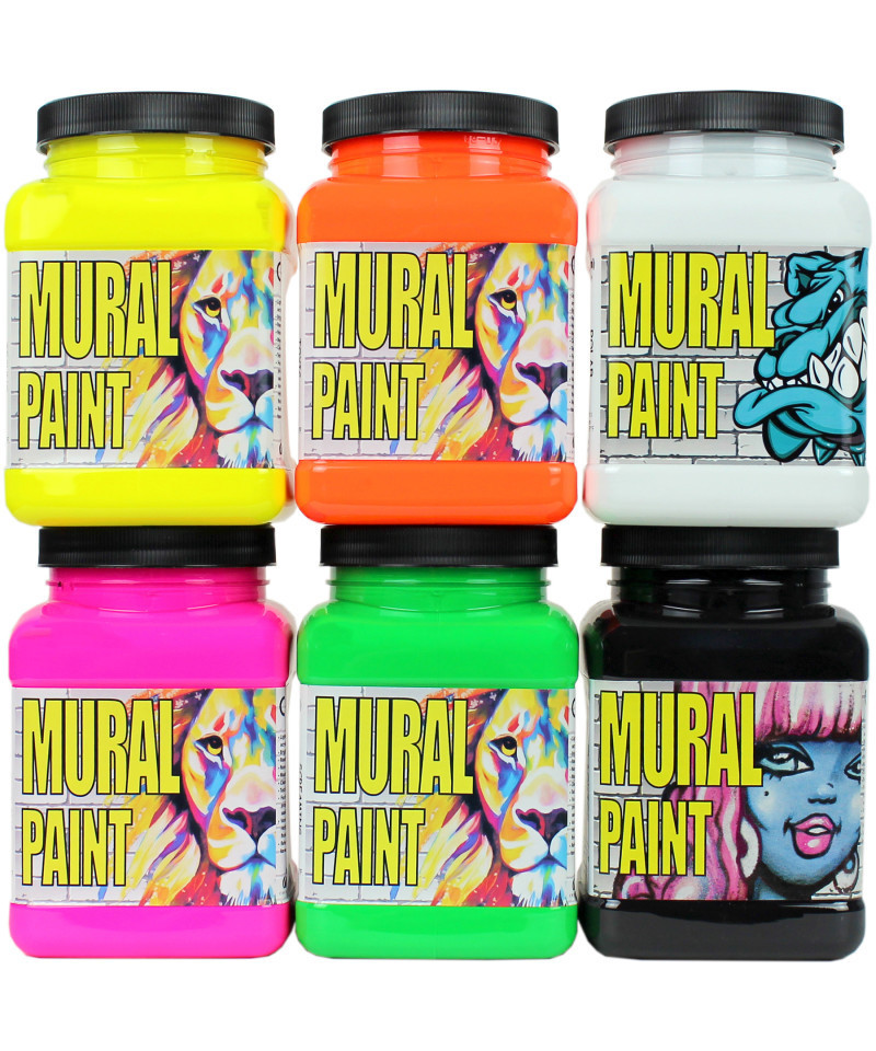 Chroma Mural Paint is specifically designed for outdoor use and street art! Chroma Acrylic Mural Paint is a lightfast, water-resistant, durable, liquid acrylic formula that is water-mixable with a low VOC. The paint is vibrantly pigmented for superior coverage and handling. Hard-wearing and water-resistant, these paints are perfect for use on virtually any surface, indoors or out, and are especially well-suited for mural and urban art. Chroma Mural Paints are non-toxic, water-resistant, and lightfast: perfect for bringing fine art to the streets! Each set includes 6 pints of mural paint neon colors: Screaming Green, Sizzling Pink, Techno Yellow, Polar, and Blacktop.