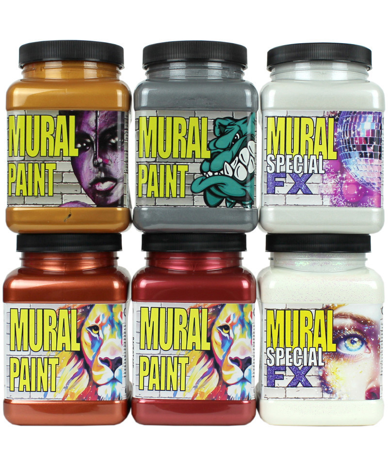Chroma Mural Paint is specifically designed for outdoor use and street art! Chroma Acrylic Mural Paint is a lightfast, water-resistant, durable, liquid acrylic formula that is water-mixable with a low VOC. The paint is vibrantly pigmented for superior coverage and handling. Hard-wearing and water-resistant, these paints are perfect for use on virtually any surface, indoors or out, and are especially well-suited for mural and urban art. Chroma Mural Paints are non-toxic, water-resistant, and lightfast: perfect for bringing fine art to the streets! Each set includes 6 pints of mural paint in metallic colors: Backstage Pass, Encore, Glam Rock, Rock Star, Disco, and Pixie Dust.
