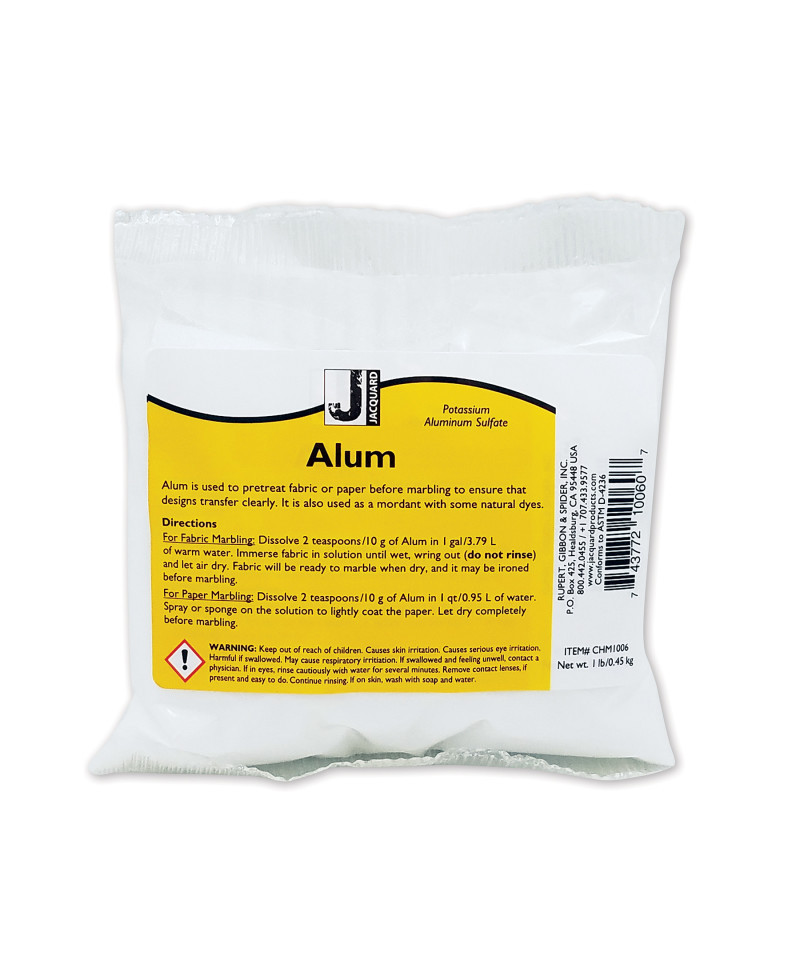 Prepare fabrics and papers for beautiful, long-lasting marbled designs with Jacquard Alum Powder Marbling Pre-Treatment, 1 lb. This professional-grade mordant helps dyes and paints adhere evenly to surfaces, ensuring sharp, vibrant, and wash-resistant results. Used as the essential first step in traditional marbling, Alum is dissolved in water and applied to paper or fabric before dipping into the marbling bath. Once treated and dried, colors float cleanly on Carrageenan solution for crisp, detailed patterns. Ideal for use with Jacquard Marbling Colors, it’s suitable for both natural fabrics and artist papers. Safe, easy to use, and highly effective, Jacquard Alum Powder delivers consistent, professional-quality results for artists, crafters, and educators exploring marbling and surface design.