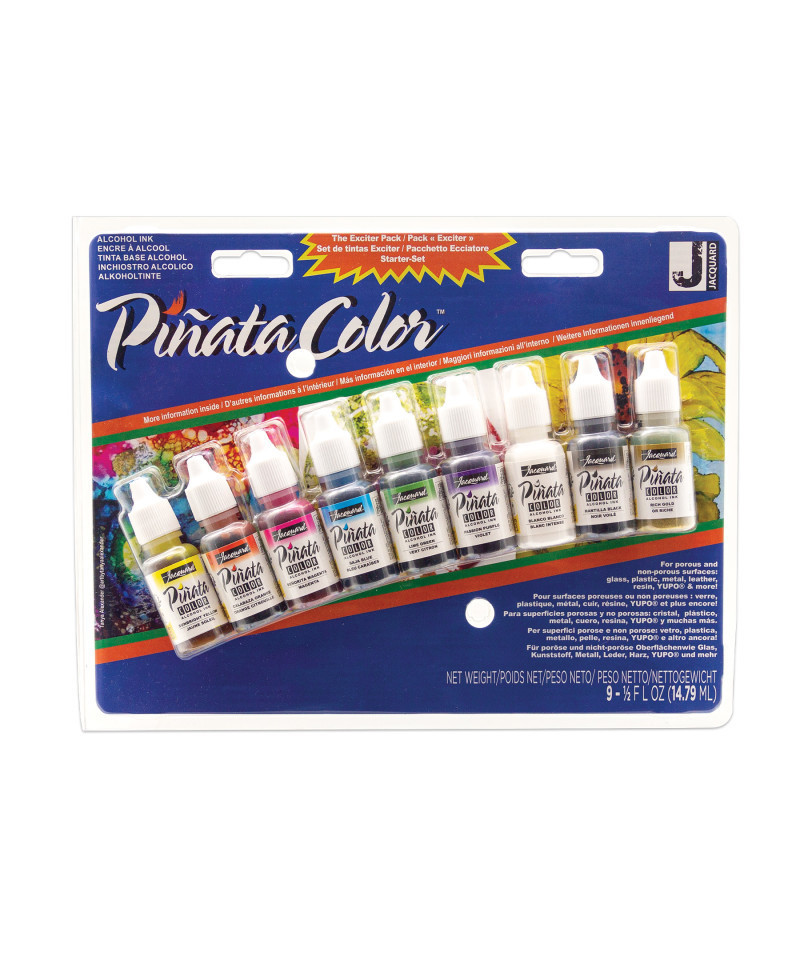 Discover the brilliance of alcohol ink art with the Jacquard Piñata Colors Alcohol Ink Exciter Pack, Assorted Colors, Set of 9. This professional-quality set features nine vibrant, highly saturated inks formulated with premium alcohol-based dyes for stunning, permanent results on non-porous surfaces. The Exciter Pack includes a spectrum of rich colors designed to inspire creativity in resin art, glass painting, ceramics, jewelry making, and mixed-media design. The inks are fast-drying, acid-free, and water-resistant, allowing artists to layer, blend, and rework colors effortlessly using Claro Extender (sold separately). Jacquard Piñata Colors provide exceptional control, luminosity, and adhesion, ideal for artists, crafters, and educators who want to add dynamic color and fluid effects to their projects.