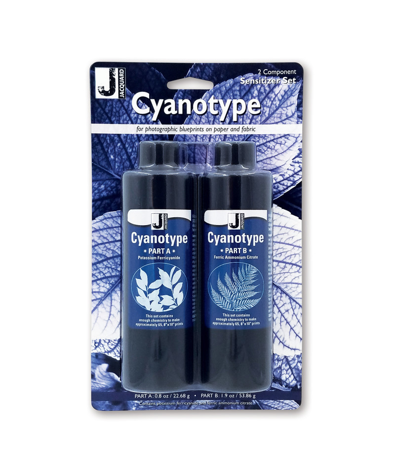 Recreate the timeless beauty of early photography with the Jacquard Cyanotype Printing Sensitizer Set. This classic alternative photographic process uses sunlight to create rich, permanent Prussian blue prints on paper, fabric, wood, and other porous surfaces, no darkroom required. The set includes two light-sensitive solutions, Potassium Ferricyanide and Ferric Ammonium Citrate, which are mixed in equal parts to form the cyanotype sensitizer. Once coated and dried, your surface becomes photo-reactive and develops when exposed to UV light. Simply rinse with water to reveal stunning blue-and-white images. Perfect for artists, photographers, educators, and crafters, the Jacquard Cyanotype Printing Sensitizer Set delivers professional-quality, archival results with simple, safe, and satisfying chemistry. This set contains enough mixture to make approximately 65 8.5" x 11" prints on paper or 50 8.5" x 11" prints on fabric, depending on the absorbency of the substrate.