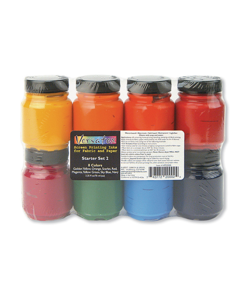Experience professional textile printing with the Jacquard Versatex Screen Printing Ink Starter, Set #2, Set of 8. These rich, water-based inks are formulated for superior coverage, soft hand, and vibrant color on both light and dark fabrics. Ideal for screen printing, block printing, stenciling, or brushwork, Versatex inks remain flexible when dry and won’t crack or peel on fabric. The set includes eight 2 oz jars in a carefully selected range of mixable hues, perfect for classrooms, studios, and small-batch printers. Colors can be blended or extended with Versatex Clear Extender for transparent effects. Safe, non-toxic, and permanent once heat-set, Jacquard Versatex Inks deliver exceptional performance for artists, educators, and textile designers who want professional results with easy cleanup and brilliant color retention.