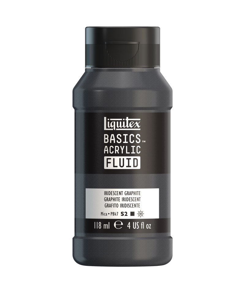 An opaque dark gray color with metallic flecks, made with iridescent mica and lamp black pigment. Enjoy smooth, pourable color with Liquitex BASICS Acrylic Fluid, 118 mL Bottle. Formulated with the same high-quality pigments as Liquitex BASICS Acrylics, this versatile fluid paint offers excellent coverage, color strength, and permanence in a low-viscosity format. It’s ideal for fine art, craft, and mixed-media techniques such as pouring, dripping, staining, and detail work. The ready-to-use consistency eliminates the need for dilution while maintaining brilliant, even color. Perfect for use on canvas, wood, paper, or fabric, it dries to a flexible, water-resistant finish with rich saturation and subtle sheen. Non-toxic and intermixable with all Liquitex acrylics and mediums, Liquitex BASICS Acrylic Fluid gives artists, educators, and students the freedom to explore expressive, high-flow applications with professional-quality results.