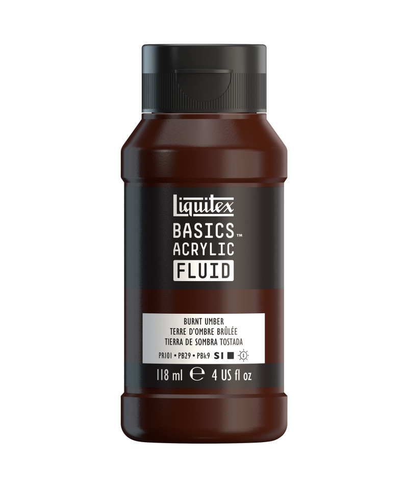 A rich dark brown single pigment color. Burnt umber is made from natural brown clays found in the earth and is named after Umbria, a region in Italy where it was first mined. Burning the raw pigment intensifies its color. Enjoy smooth, pourable color with Liquitex BASICS Acrylic Fluid, 118 mL Bottle. Formulated with the same high-quality pigments as Liquitex BASICS Acrylics, this versatile fluid paint offers excellent coverage, color strength, and permanence in a low-viscosity format. It’s ideal for fine art, craft, and mixed-media techniques such as pouring, dripping, staining, and detail work. The ready-to-use consistency eliminates the need for dilution while maintaining brilliant, even color. Perfect for use on canvas, wood, paper, or fabric, it dries to a flexible, water-resistant finish with rich saturation and subtle sheen. Non-toxic and intermixable with all Liquitex acrylics and mediums, Liquitex BASICS Acrylic Fluid gives artists, educators, and students the freedom to explore expressive, high-flow applications with professional-quality results.