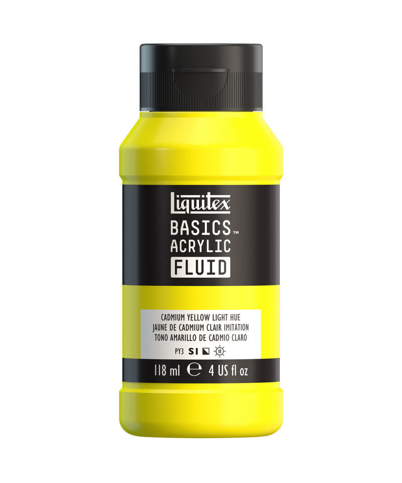 A bright yellow hue color with semi-opacity. This hue is a recreation of the true inorganic cadmium pigment, which was discovered in 1817 as a by-product of the zinc industry. Enjoy smooth, pourable color with Liquitex BASICS Acrylic Fluid, 118 mL Bottle. Formulated with the same high-quality pigments as Liquitex BASICS Acrylics, this versatile fluid paint offers excellent coverage, color strength, and permanence in a low-viscosity format. It’s ideal for fine art, craft, and mixed-media techniques such as pouring, dripping, staining, and detail work. The ready-to-use consistency eliminates the need for dilution while maintaining brilliant, even color. Perfect for use on canvas, wood, paper, or fabric, it dries to a flexible, water-resistant finish with rich saturation and subtle sheen. Non-toxic and intermixable with all Liquitex acrylics and mediums, Liquitex BASICS Acrylic Fluid gives artists, educators, and students the freedom to explore expressive, high-flow applications with professional-quality results.
