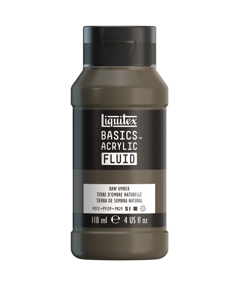 An intensely rich dark brown color, with a high opacity. Raw umber is named after Umbria, a region in Italy where it was first mined. Enjoy smooth, pourable color with Liquitex BASICS Acrylic Fluid, 118 mL Bottle. Formulated with the same high-quality pigments as Liquitex BASICS Acrylics, this versatile fluid paint offers excellent coverage, color strength, and permanence in a low-viscosity format. It’s ideal for fine art, craft, and mixed-media techniques such as pouring, dripping, staining, and detail work. The ready-to-use consistency eliminates the need for dilution while maintaining brilliant, even color. Perfect for use on canvas, wood, paper, or fabric, it dries to a flexible, water-resistant finish with rich saturation and subtle sheen. Non-toxic and intermixable with all Liquitex acrylics and mediums, Liquitex BASICS Acrylic Fluid gives artists, educators, and students the freedom to explore expressive, high-flow applications with professional-quality results.