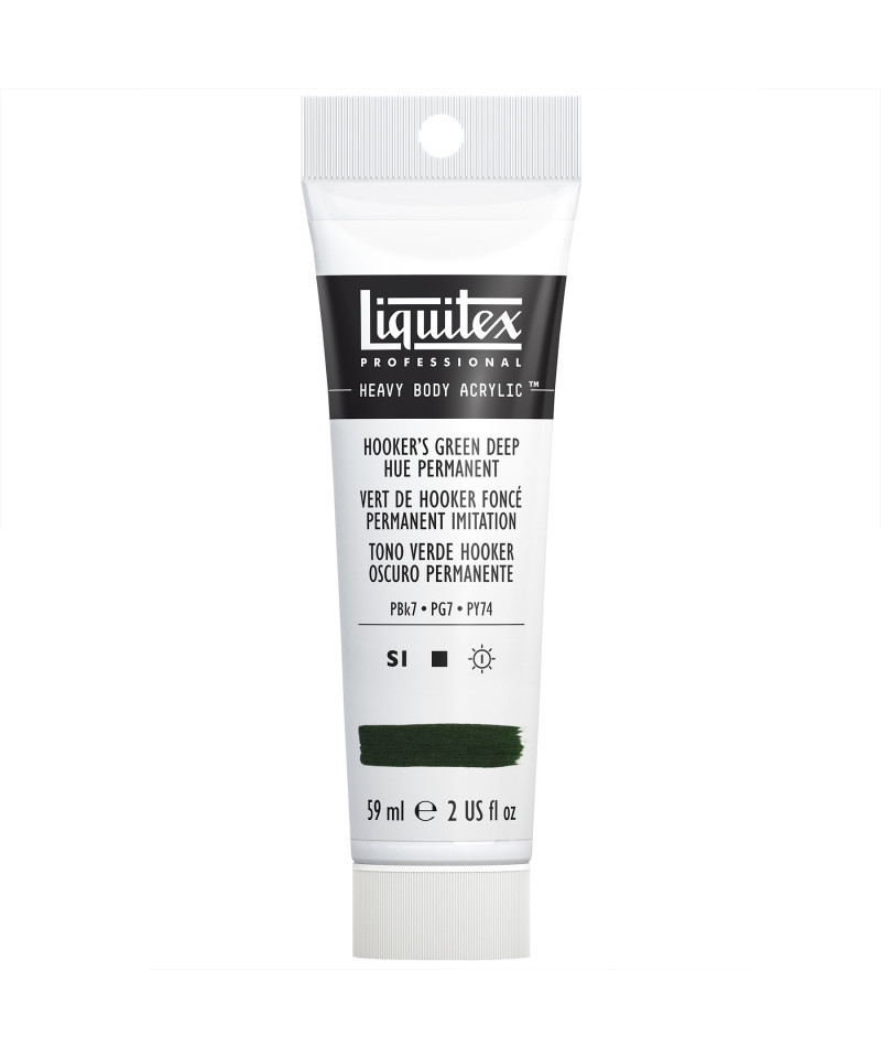 A deep dark green opaque color with a yellow tint. A mixed pigment hue, the original Hooker's green pigment was created by 19th century English botanist and illustrator William J Hooker. Experience rich texture and exceptional pigment strength with Liquitex Professional Heavy Body Acrylic Paint, 59 mL Tube. Known for its buttery consistency and intense color load, this professional-grade acrylic delivers outstanding coverage, permanence, and flexibility across a wide range of surfaces. The high-viscosity formula retains brushstrokes and knife marks beautifully, making it ideal for impasto, layering, and mixed-media techniques. Every color is made with lightfast, artist-quality pigments for consistent, archival results that won’t fade or crack over time. Perfect for fine artists, educators, and advanced students, Liquitex Professional Heavy Body Acrylic provides the tactile experience of oil paint with the fast-drying, water-based convenience of acrylics. Mix it with Liquitex mediums for limitless texture, transparency, and finish options.