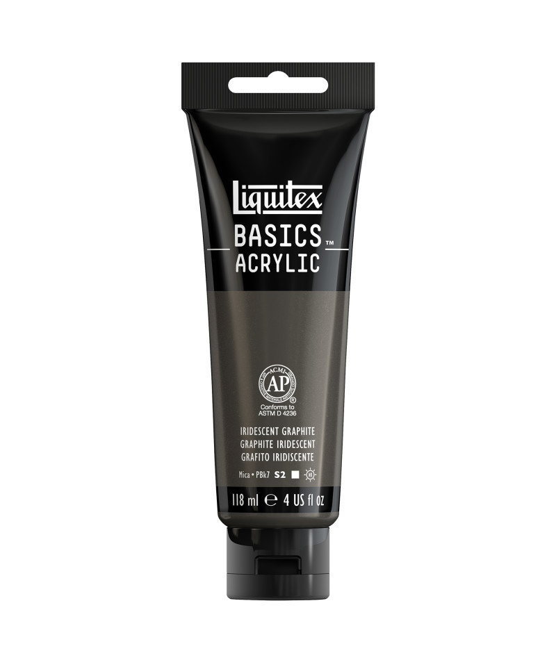 An opaque dark gray color with metallic flecks, made with iridescent mica and lamp black pigment. Whether you’re a beginner on a budget, an experienced artist doing underpainting or sketching, or a creative professional doing color scoping and exploration, Liquitex Basics Acrylic has you covered. Formulated with the same lightfast, fine art pigments used in our professional range (just with a lighter pigment load), Basics Acrylic delivers a lightfast, medium viscosity experience that sacrifices nothing. It’s the perfect balance of quality, versatility, and economy. So, what are you waiting for? Jump straight in, go for it, and see what happens. Experience The Everyday Acrylic.