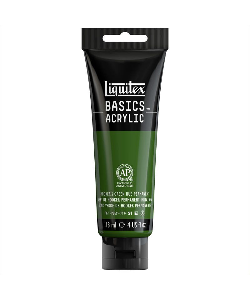 A rich dark green opaque color with a yellow tint. A mixed pigment hue, the original Hooker's green pigment was created by 19th century English botanist and illustrator William J Hooker. Whether you’re a beginner on a budget, an experienced artist doing underpainting or sketching, or a creative professional doing color scoping and exploration, Liquitex Basics Acrylic has you covered. Formulated with the same lightfast, fine art pigments used in our professional range (just with a lighter pigment load), Basics Acrylic delivers a lightfast, medium viscosity experience that sacrifices nothing. It’s the perfect balance of quality, versatility, and economy. So, what are you waiting for? Jump straight in, go for it, and see what happens. Experience The Everyday Acrylic.