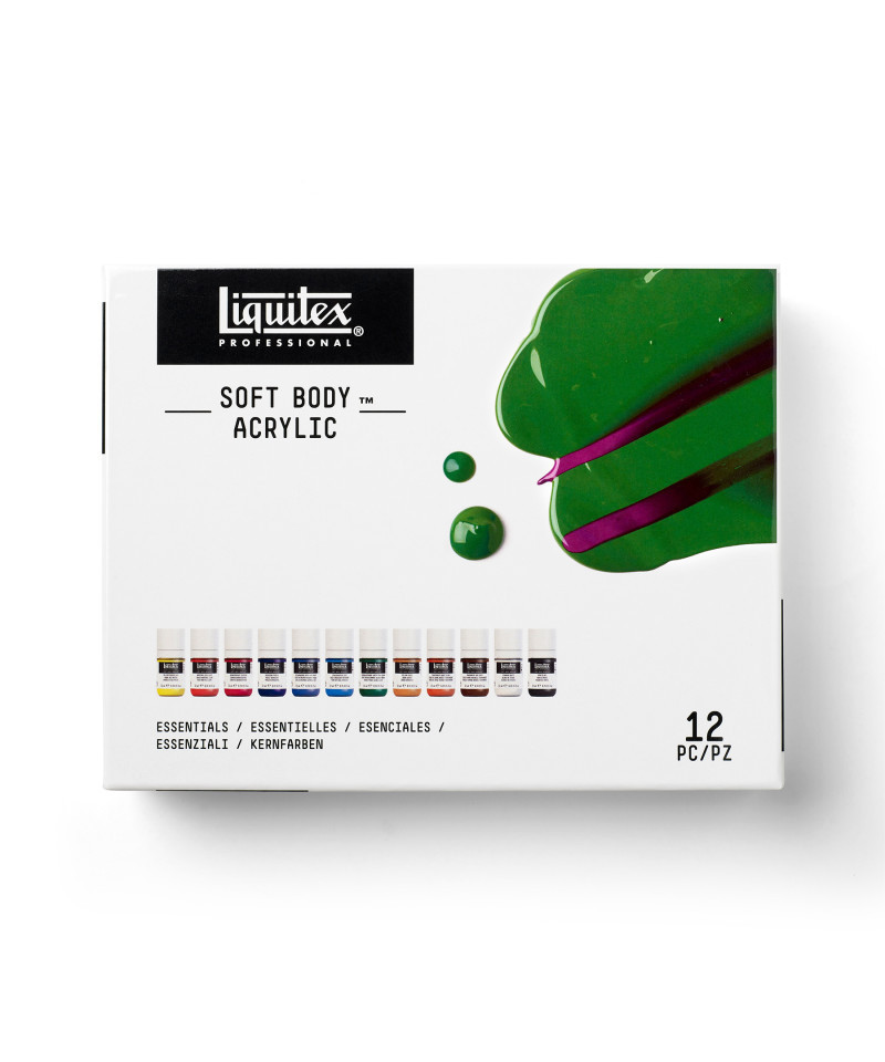 This is Soft Body Acrylic. This set brings together a selection of core colors to help you build your base palette. With exceptional versatility, Soft Body gives you the freedom to paint, pour, glaze or print on almost any surface. As our most versatile format, its low viscosity consistency takes you seamlessly from silk screen to fine detail illustration, large surface to air brush as your creativity drives you. Its finely milled high pigment load guarantees smooth, even vibrancy whatever technique or surface you're working on. Open up a bottle of Liquitex Soft Body today and unleash a world of possibilities.