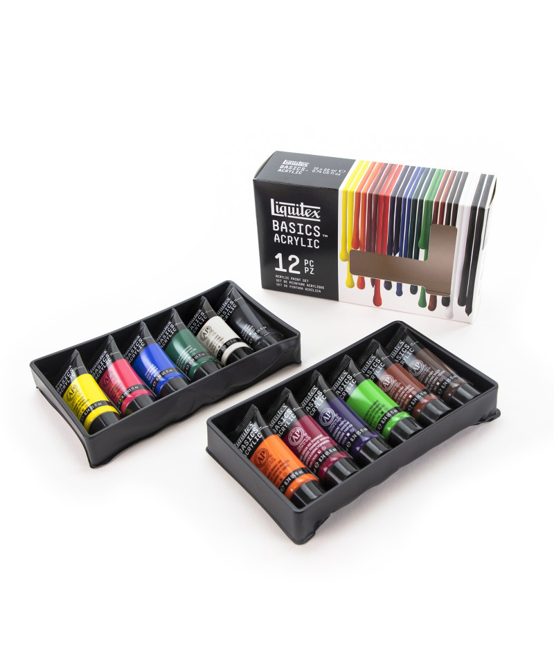 Basics is our student-quality line, made for everyday use by all kinds of artists. Featuring Basics medium-consistency acrylic paint, this set contains 12 useful colors to help build your palette. Whether you’re a beginner on a budget, an experienced artist doing underpainting or sketching, or a creative professional doing color scoping and exploration, Liquitex Basics Acrylic has you covered. Formulated with the same lightfast, fine art pigments used in our professional range (just with a lighter pigment load), Basics Acrylic delivers a lightfast, medium viscosity experience that sacrifices nothing. It’s the perfect balance of quality, versatility, and economy. So, what are you waiting for? Jump straight in, go for it, and see what happens. Experience The Everyday Acrylic.