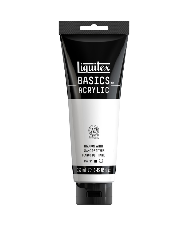 A brilliant white single pigment color, which offers the strongest, most opaque of all whites. Titanium white is an inorganic pigment introduced in the early 1900s from titanium dioxide and is named after Titan. It's still the world's primary pigment for whiteness, brightness and opacity. Whether you’re a beginner on a budget, an experienced artist doing underpainting or sketching, or a creative professional doing color scoping and exploration, Liquitex Basics Acrylic has you covered. Formulated with the same lightfast, fine art pigments used in our professional range (just with a lighter pigment load), Basics Acrylic delivers a lightfast, medium viscosity experience that sacrifices nothing. It’s the perfect balance of quality, versatility, and economy. So, what are you waiting for? Jump straight in, go for it, and see what happens. Experience The Everyday Acrylic.