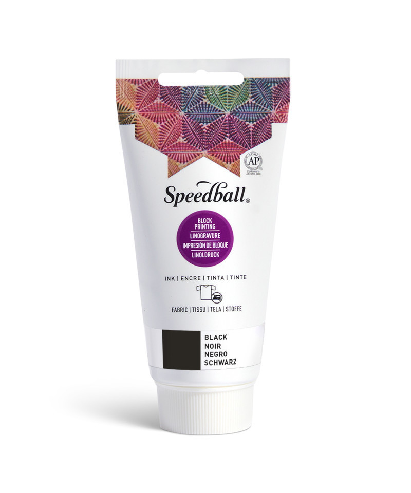 Print vibrant, lasting designs directly onto fabric with Speedball® Fabric Block Printing Ink, 2.5 oz, Black. This innovative ink eliminates the need for heat setting, simplifying the fabric printing process while ensuring durable, colorfast results. Formulated for use on both natural and synthetic fabrics, it delivers excellent coverage, smooth roll-out, and deep, opaque black prints that remain soft and flexible once dry. The creamy consistency provides even ink distribution and sharp detail when applied to linoleum, wood, or soft-cut blocks. Water-soluble for easy cleanup with soap and water, this non-toxic ink dries to a permanent finish that stands up to repeated washings. Speedball Fabric Block Printing Ink is the perfect solution for artists, crafters, and educators seeking convenience, vibrancy, and performance, without the need for additional steps.