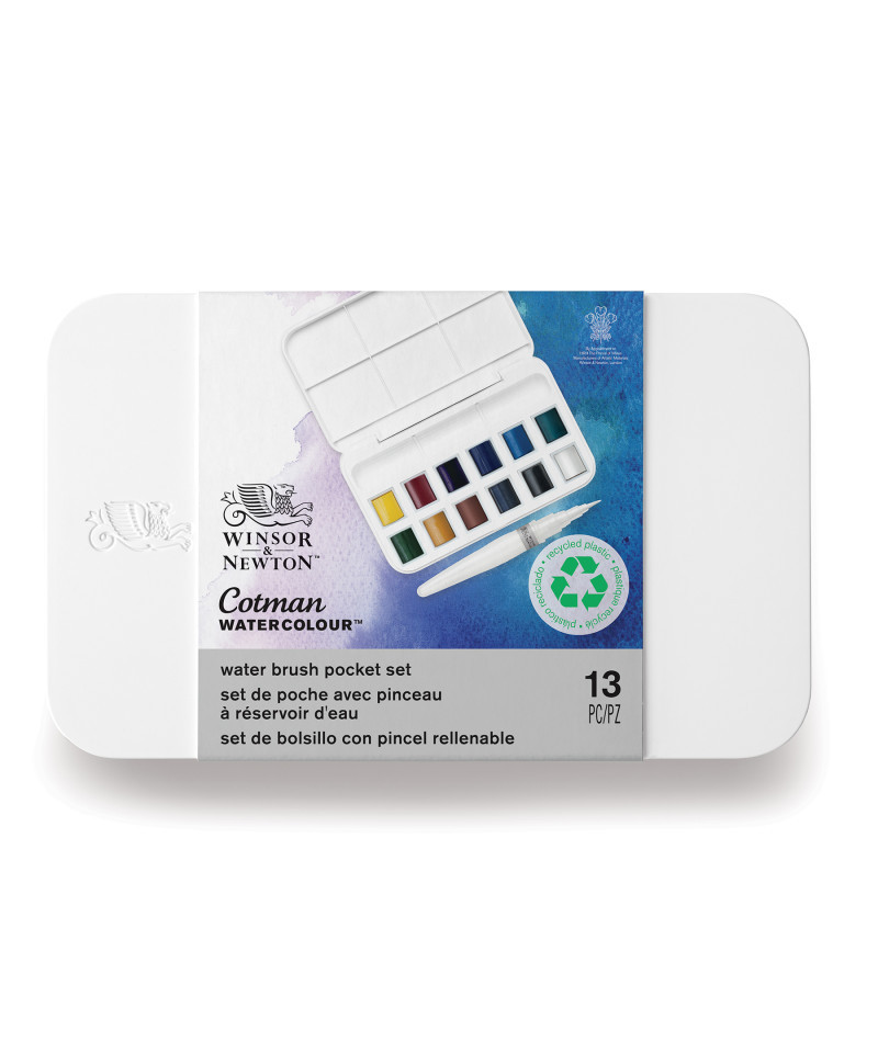 The Winsor & Newton Cotman Watercolor Water Brush Pocket Set is designed for effortless outdoor painting, travel sketching, and on-the-go creativity. This compact, pocket-sized kit includes 12 Cotman half pans crafted with quality, fine-art pigments for vibrant washes and consistent transparency. The standout feature is the water brush, which has a built-in water reservoir in the handle, allowing artists to paint anywhere without needing a separate water container. Colors included are Lemon Yellow Hue, Permanent Rose, Dioxazine Purple, Ultramarine, Cerulean Blue Hue, Viridian Hue, Sap Green, Yellow Ochre, Burnt Sienna, Payne's Gray, Lamp Black, and Chinese White. With multiple mixing areas integrated into the case, this set offers a complete, portable watercolor solution ideal for field studies, travel journals, urban sketching, and classroom use.
