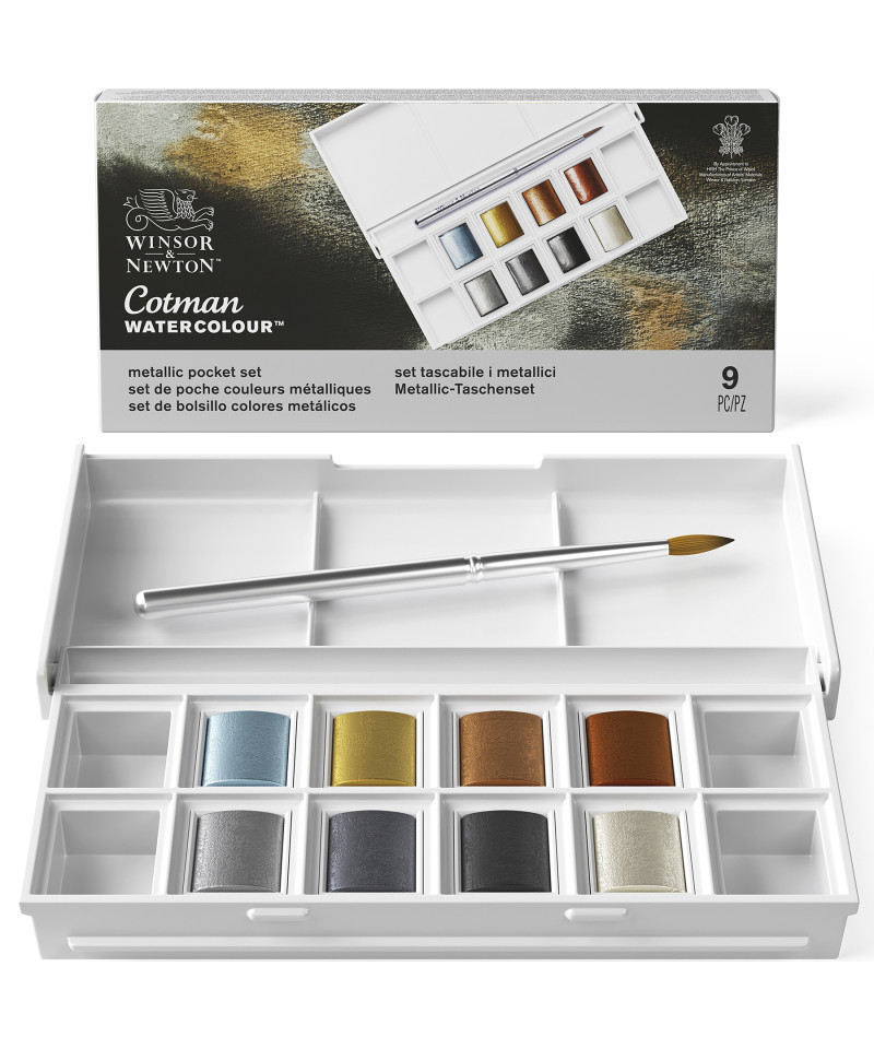 - Metallic specialty palette: Includes 8 Cotman half pans in shimmering metallic and iridescent tones.