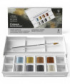 The Winsor & Newton Cotman Watercolor Metallic Pocket Set offers a shimmering collection of 8 Cotman metallic half pans designed to bring luminous effects and striking highlights to watercolor artworks. This compact pocket set includes Iridescent Blue, Yellow Gold, Bronze, Red Copper, Silver, Pewter, Iridescent Black, and Iridescent White, providing a dazzling range of reflective tones ideal for adding dimension, accents, and mixed-media enhancement. The case includes a travel brush and features built-in mixing areas, making it easy to blend metallic hues or combine them with traditional watercolors. Lightweight, durable, and perfectly sized for fieldwork or studio use, this set is excellent for illustrators, hobbyists, and creative painters exploring metallic effects, fantasy art, calligraphy, decorative detailing, and more.