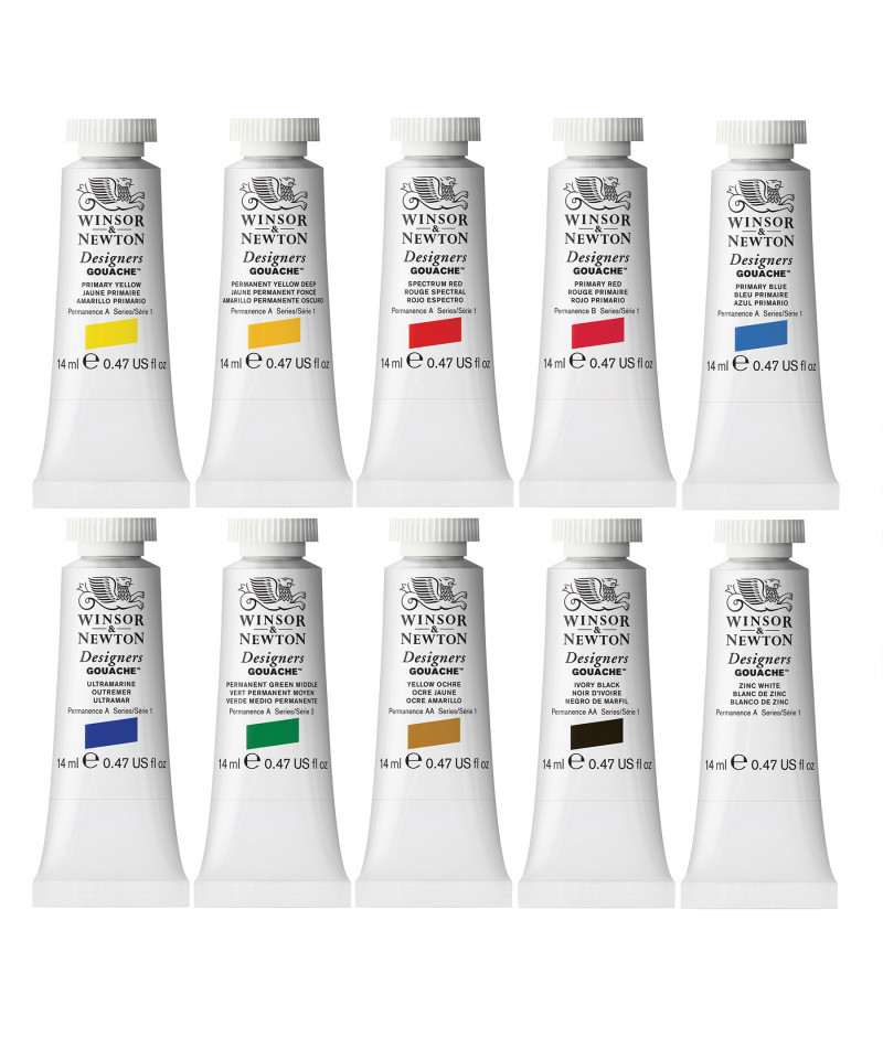 Winsor & Newton has been making Designers Gouache Paint since 1935. Popular among designers, illustrators and commercial artists, this gouache paint is perfect for creating bold, vibrant artworks. All these tones are intermixable and you can pair them with watercolors for a flat, matte color effect. This is an ideal starter set with a selection of (10) 14 mL tubes. Includes: Primary Yellow, Permanent Yellow Deep, Spectrum Red, Primary Red, Ultramarine, Primary Blue, Permanent Green Middle, Yellow Ochre, Ivory Black, and Zinc White.