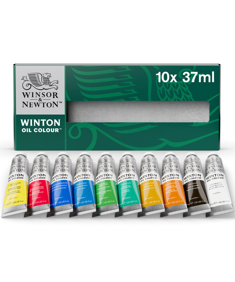 Winsor & Newton's Winton Oil Color Paint line is a bright, beautiful, and affordable range of oil paints, perfect for artists who want to experiment or need large quantities of color. All of the tones have been carefully made to bring out the best of each pigment, so you can create bold and vibrant artworks. This basic color set contains a comprehensive range of colors in 37 mL tubes. Includes: Titanium White, Ivory Black, Burnt Sienna, Yellow Ochre, Viridian Hue, Permanent green light, Phthalo Blue, French Ultramarine, Cadmium Red Deep Hue, and Cadmium Yellow Pale Hue.