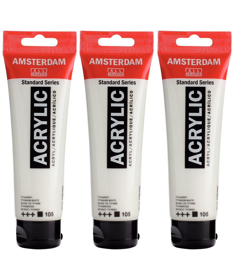 Amsterdam Standard Series acrylic paint in Titanium White (105) is an opaque color with an excellent lightfastness. Our Standard Series offers you the broadest range of remarkably vibrant acrylic colors. This versatile paint is easy to work with and offers a smooth application. Use the paint straight from the tube or thinned with a little bit of water or one of our acrylic mediums. Medium viscosity paint for visible brush strokes, texture and smooth coverage with a satin finish. Made with high-quality, lightfast pigments. Formulated with 100% acrylic resin binder, resulting in an exceptionally durable and flexible paint film with a uniform degree of gloss. Odorless, water-based formula that becomes waterproof and permanent when dry. Extensive range of 102 colors available in 20ml and 120ml tubes, of which up to 90 colors are also available in larger sizes. The range of colors includes both traditional and modern colors such as reflex and metallic variants. Adheres to virtually any slightly porous surface, including canvas, paper, cardboard, wood, stone and cement. Proudly crafted in the Netherlands. Sold as a pack of 3.