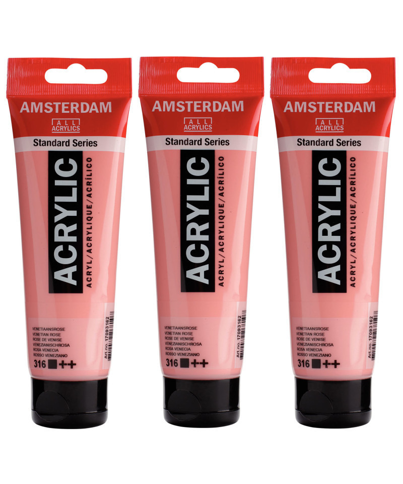 Amsterdam Standard Series acrylic paint in Venetian rose (316) is an opaque color with a very good lightfastness (++). Our Standard Series offers you the broadest range of remarkably vibrant acrylic colors. This versatile paint is easy to work with and offers a smooth application. Use the paint straight from the tube or thinned with a little bit of water or one of our acrylic mediums. Medium viscosity paint for visible brush strokes, texture and smooth coverage with a satin finish. Made with high-quality, lightfast pigments. Formulated with 100% acrylic resin binder, resulting in an exceptionally durable and flexible paint film with a uniform degree of gloss. Odorless, water-based formula that becomes waterproof and permanent when dry. Extensive range of 102 colors available in 20ml and 120ml tubes, of which up to 90 colors are also available in larger sizes. The range of colors includes both traditional and modern colors such as reflex and metallic variants. Adheres to virtually any slightly porous surface, including canvas, paper, cardboard, wood, stone and cement. Proudly crafted in the Netherlands. Sold as a pack of 3.