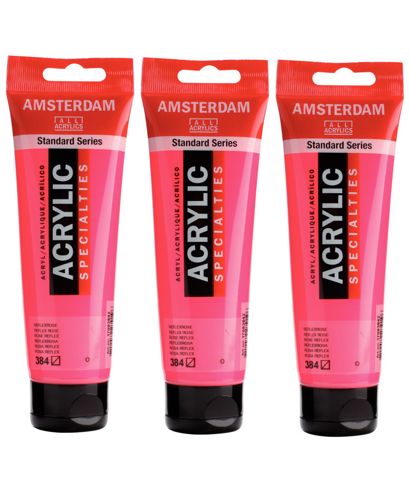 Amsterdam Standard Series acrylic paint in Reflex Rose (384) is a semi-transparent color with no lightfastness (˚). Our Standard Series offers you the broadest range of remarkably vibrant acrylic colors. This versatile paint is easy to work with and offers a smooth application. Use the paint straight from the tube or thinned with a little bit of water or one of our acrylic mediums. Medium viscosity paint for visible brush strokes, texture and smooth coverage with a satin finish. Made with high-quality, lightfast pigments. Formulated with 100% acrylic resin binder, resulting in an exceptionally durable and flexible paint film with a uniform degree of gloss. Odorless, water-based formula that becomes waterproof and permanent when dry. Extensive range of 102 colors available in 20ml and 120ml tubes, of which up to 90 colors are also available in larger sizes. The range of colors includes both traditional and modern colors such as reflex and metallic variants. Adheres to virtually any slightly porous surface, including canvas, paper, cardboard, wood, stone and cement. Proudly crafted in the Netherlands. Sold as a pack of 3.