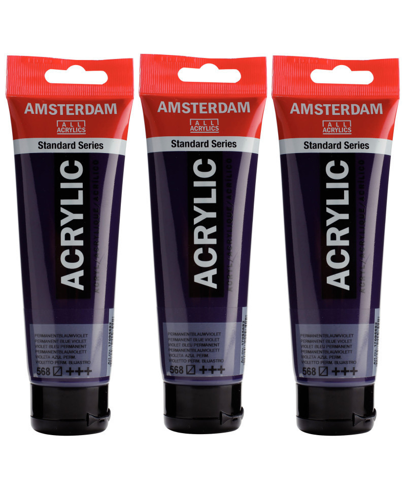 Amsterdam Standard Series acrylic paint in Permanent Blue Violet (568) is a semi-transparent color with an excellent lightfastness. Our Standard Series offers you the broadest range of remarkably vibrant acrylic colors. This versatile paint is easy to work with and offers a smooth application. Use the paint straight from the tube or thinned with a little bit of water or one of our acrylic mediums. Medium viscosity paint for visible brush strokes, texture and smooth coverage with a satin finish. Made with high-quality, lightfast pigments. Formulated with 100% acrylic resin binder, resulting in an exceptionally durable and flexible paint film with a uniform degree of gloss. Odorless, water-based formula that becomes waterproof and permanent when dry. Extensive range of 102 colors available in 20ml and 120ml tubes, of which up to 90 colors are also available in larger sizes. The range of colors includes both traditional and modern colors such as reflex and metallic variants. Adheres to virtually any slightly porous surface, including canvas, paper, cardboard, wood, stone and cement. Proudly crafted in the Netherlands. Sold as a pack of 3.