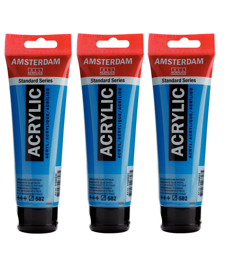 Amsterdam Standard Series acrylic paint in Manganese Blue Phthalo (582) is a semi-transparent color with an excellent lightfastness. Our Standard Series offers you the broadest range of remarkably vibrant acrylic colors. This versatile paint is easy to work with and offers a smooth application. Use the paint straight from the tube or thinned with a little bit of water or one of our acrylic mediums. Medium viscosity paint for visible brush strokes, texture and smooth coverage with a satin finish. Made with high-quality, lightfast pigments. Formulated with 100% acrylic resin binder, resulting in an exceptionally durable and flexible paint film with a uniform degree of gloss. Odorless, water-based formula that becomes waterproof and permanent when dry. Extensive range of 102 colors available in 20ml and 120ml tubes, of which up to 90 colors are also available in larger sizes. The range of colors includes both traditional and modern colors such as reflex and metallic variants. Adheres to virtually any slightly porous surface, including canvas, paper, cardboard, wood, stone and cement. Proudly crafted in the Netherlands. Sold as a pack of 3.