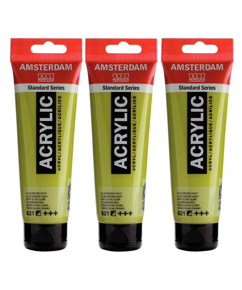 Amsterdam Standard Series acrylic paint in Olive Green Light (621) is a semi-opaque color with an excellent lightfastness. Our Standard Series offers you the broadest range of remarkably vibrant acrylic colors. This versatile paint is easy to work with and offers a smooth application. Use the paint straight from the tube or thinned with a little bit of water or one of our acrylic mediums. Medium viscosity paint for visible brush strokes, texture and smooth coverage with a satin finish. Made with high-quality, lightfast pigments. Formulated with 100% acrylic resin binder, resulting in an exceptionally durable and flexible paint film with a uniform degree of gloss. Odorless, water-based formula that becomes waterproof and permanent when dry. Extensive range of 102 colors available in 20ml and 120ml tubes, of which up to 90 colors are also available in larger sizes. The range of colors includes both traditional and modern colors such as reflex and metallic variants. Adheres to virtually any slightly porous surface, including canvas, paper, cardboard, wood, stone and cement. Proudly crafted in the Netherlands. Sold as a pack of 3.