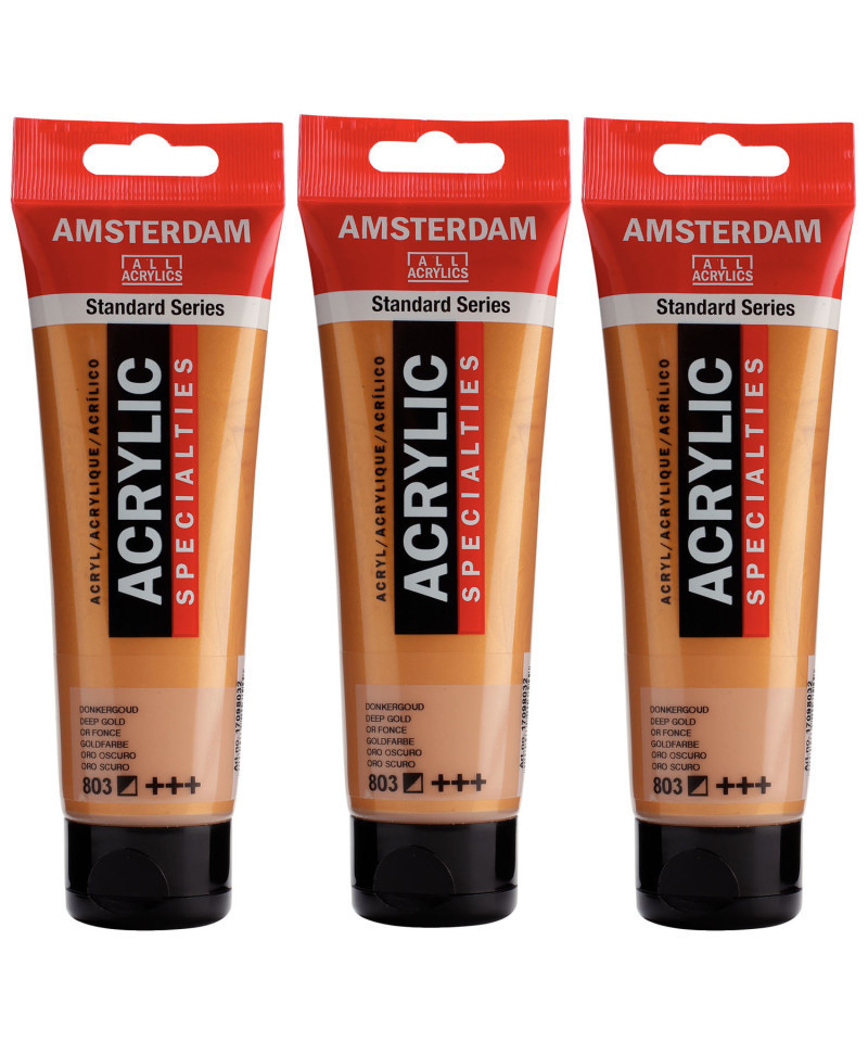 Amsterdam Standard Series acrylic paint in Deep Gold (803) is a semi-opaque color with an excellent lightfastness. Our Standard Series offers you the broadest range of remarkably vibrant acrylic colors. This versatile paint is easy to work with and offers a smooth application. Use the paint straight from the tube or thinned with a little bit of water or one of our acrylic mediums. Medium viscosity paint for visible brush strokes, texture and smooth coverage with a satin finish. Made with high-quality, lightfast pigments. Formulated with 100% acrylic resin binder, resulting in an exceptionally durable and flexible paint film with a uniform degree of gloss. Odorless, water-based formula that becomes waterproof and permanent when dry. Extensive range of 102 colors available in 20ml and 120ml tubes, of which up to 90 colors are also available in larger sizes. The range of colors includes both traditional and modern colors such as reflex and metallic variants. Adheres to virtually any slightly porous surface, including canvas, paper, cardboard, wood, stone and cement. Proudly crafted in the Netherlands. Sold as a pack of 3.