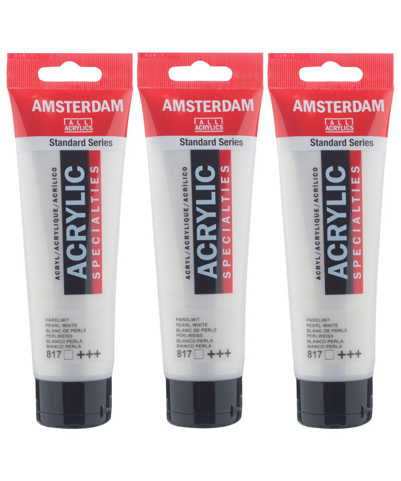 Amsterdam Standard Series acrylic paint in Pearl White (817) is a transparent color with an excellent lightfastness. Our Standard Series offers you the broadest range of remarkably vibrant acrylic colors. This versatile paint is easy to work with and offers a smooth application. Use the paint straight from the tube or thinned with a little bit of water or one of our acrylic mediums. Medium viscosity paint for visible brush strokes, texture and smooth coverage with a satin finish. Made with high-quality, lightfast pigments. Formulated with 100% acrylic resin binder, resulting in an exceptionally durable and flexible paint film with a uniform degree of gloss. Odorless, water-based formula that becomes waterproof and permanent when dry. Extensive range of 102 colors available in 20ml and 120ml tubes, of which up to 90 colors are also available in larger sizes. The range of colors includes both traditional and modern colors such as reflex and metallic variants. Adheres to virtually any slightly porous surface, including canvas, paper, cardboard, wood, stone and cement. Proudly crafted in the Netherlands. Sold as a pack of 3.