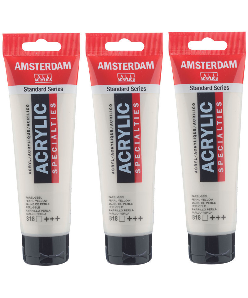 Amsterdam Standard Series acrylic paint in Pearl Yellow (818) is a transparent color with an excellent lightfastness. Our Standard Series offers you the broadest range of remarkably vibrant acrylic colors. This versatile paint is easy to work with and offers a smooth application. Use the paint straight from the tube or thinned with a little bit of water or one of our acrylic mediums. Medium viscosity paint for visible brush strokes, texture and smooth coverage with a satin finish. Made with high-quality, lightfast pigments. Formulated with 100% acrylic resin binder, resulting in an exceptionally durable and flexible paint film with a uniform degree of gloss. Odorless, water-based formula that becomes waterproof and permanent when dry. Extensive range of 102 colors available in 20ml and 120ml tubes, of which up to 90 colors are also available in larger sizes. The range of colors includes both traditional and modern colors such as reflex and metallic variants. Adheres to virtually any slightly porous surface, including canvas, paper, cardboard, wood, stone and cement. Proudly crafted in the Netherlands. Sold as a pack of 3.