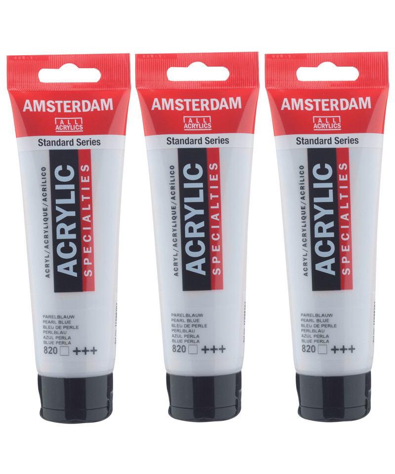 Amsterdam Standard Series acrylic paint in Pearl Blue (820) is a transparent color with an excellent lightfastness. Our Standard Series offers you the broadest range of remarkably vibrant acrylic colors. This versatile paint is easy to work with and offers a smooth application. Use the paint straight from the tube or thinned with a little bit of water or one of our acrylic mediums. Medium viscosity paint for visible brush strokes, texture and smooth coverage with a satin finish. Made with high-quality, lightfast pigments. Formulated with 100% acrylic resin binder, resulting in an exceptionally durable and flexible paint film with a uniform degree of gloss. Odorless, water-based formula that becomes waterproof and permanent when dry. Extensive range of 102 colors available in 20ml and 120ml tubes, of which up to 90 colors are also available in larger sizes. The range of colors includes both traditional and modern colors such as reflex and metallic variants. Adheres to virtually any slightly porous surface, including canvas, paper, cardboard, wood, stone and cement. Proudly crafted in the Netherlands. Sold as a pack of 3.