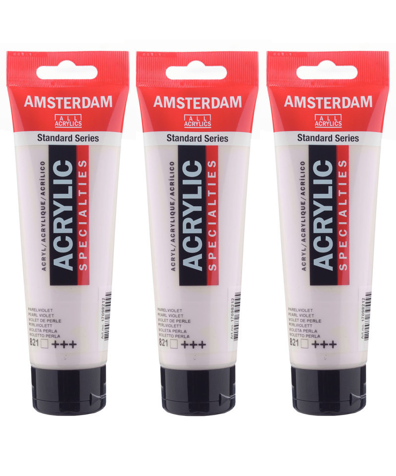 Amsterdam Standard Series acrylic paint in Pearl Violet (821) is a transparent color with an excellent lightfastness. Our Standard Series offers you the broadest range of remarkably vibrant acrylic colors. This versatile paint is easy to work with and offers a smooth application. Use the paint straight from the tube or thinned with a little bit of water or one of our acrylic mediums. Medium viscosity paint for visible brush strokes, texture and smooth coverage with a satin finish. Made with high-quality, lightfast pigments. Formulated with 100% acrylic resin binder, resulting in an exceptionally durable and flexible paint film with a uniform degree of gloss. Odorless, water-based formula that becomes waterproof and permanent when dry. Extensive range of 102 colors available in 20ml and 120ml tubes, of which up to 90 colors are also available in larger sizes. The range of colors includes both traditional and modern colors such as reflex and metallic variants. Adheres to virtually any slightly porous surface, including canvas, paper, cardboard, wood, stone and cement. Proudly crafted in the Netherlands. Sold as a pack of 3.