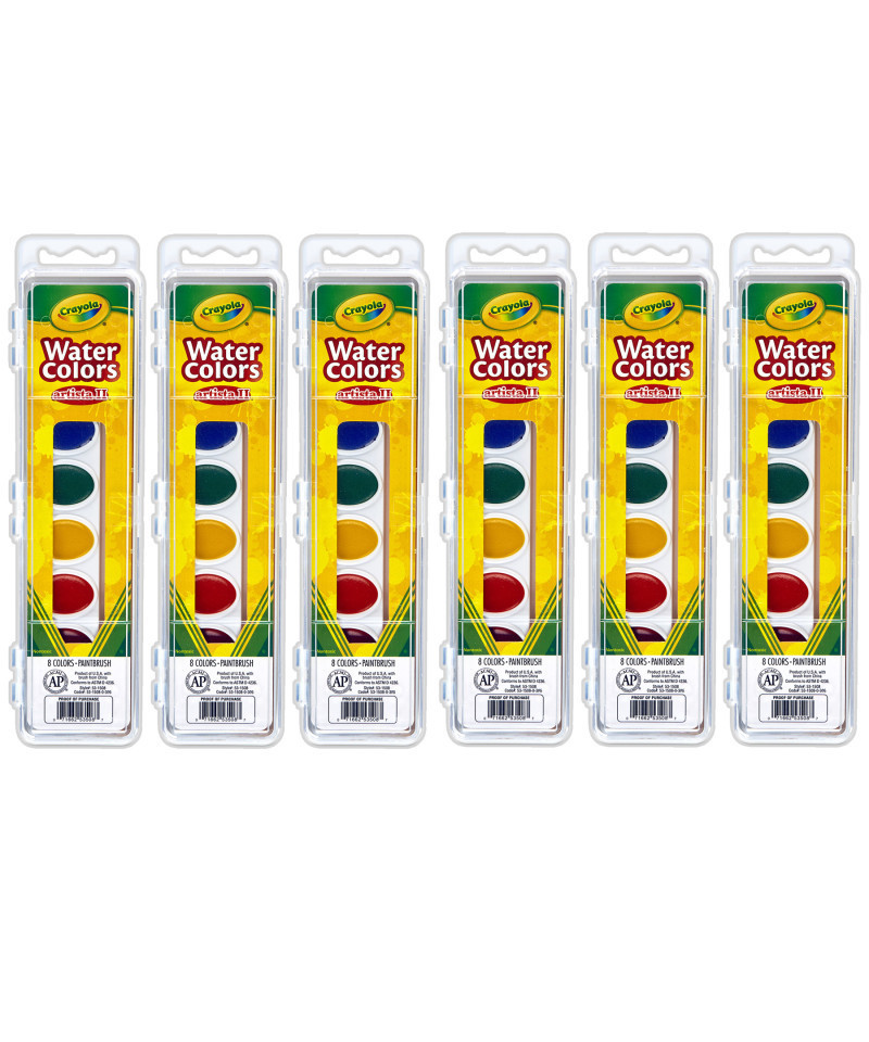 Artista II Watercolor Set offers bright colors for your creations. The eight semi-moist oval pans of colors and one brush come in a plastic case to keep the watercolors ready to use. Lid is hinged for easy opening and so the case lies flat during use. Bright, economically-priced watercolors in semi-moist pans in a plastic box. Brush included. Each watercolor paint set contains 8 colors and a paint brush. Sold as a pack of 6 watercolor paint sets.