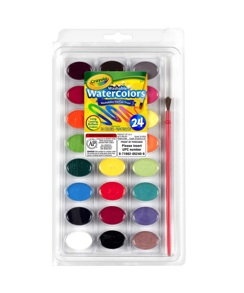 Crayola washable watercolors contains 24 popular colors and includes a paint brush to complete this ready to use set. Comes in a peggable plastic case. Watercolor art is less messy and lets kids be creative. Kids of all ages will enjoy painting with this watercolor set.