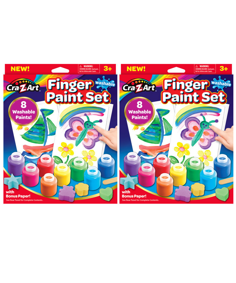 Perfect for young artists, this awesome finger paint set includes 8 washable paints, paper, and 6 adorable shaped sponges. Easy to use, vibrant in color, and super washable! Each set includes 8 Paint Jars (2 fl. oz. each), 6 Shaped Sponges, 2 Wood Craft Sticks, 8 Paper Sheets (6.25" x 9.5"). Sold as a pack of 2 complete finger paint sets.