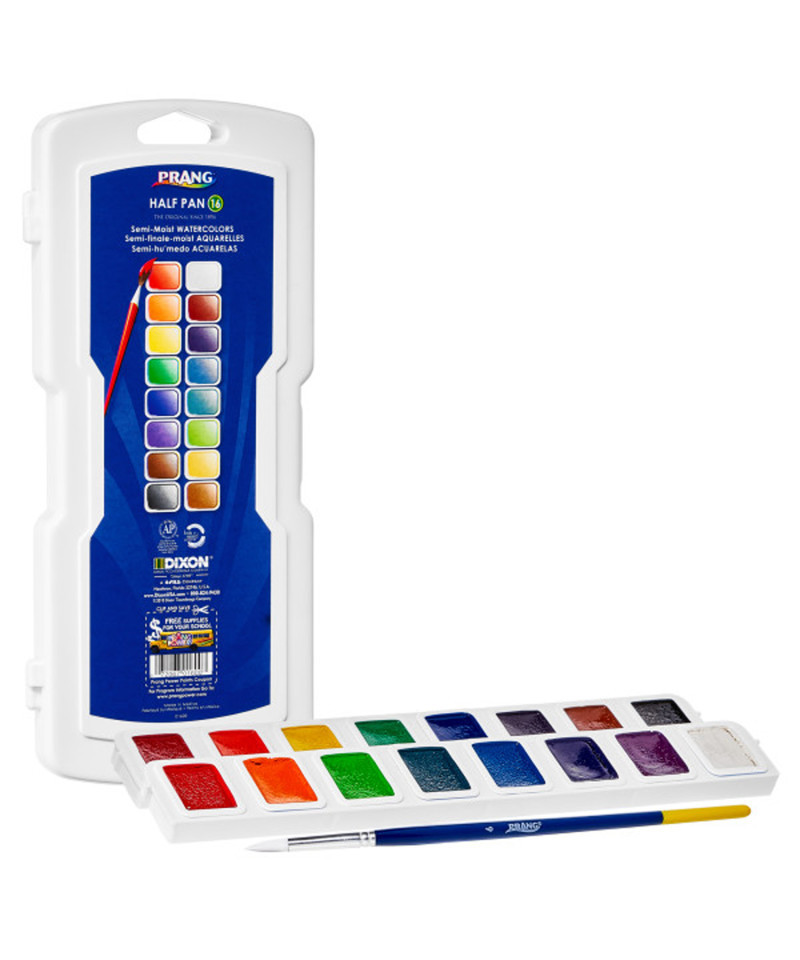 Prang watercolor half pan set are semi-moist watercolors with intense wax free pigments. You will experience a smooth laydown of brilliant colors with limitless textures. The easy snap-in refill pans help you match your preferred colors more economically. This watercolor set includes 16 brilliant colors and a strong white case with built-in mixing areas along with a top quality paintbrush. AP certified non-toxic.